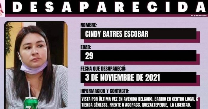 La joven Cindy Liliana Batres Escobar de 29 años de edad había sido reportada como desparecida por su familia desde el pasado 3 de noviembre en el municipio de Quezaltepeque, La libertad.