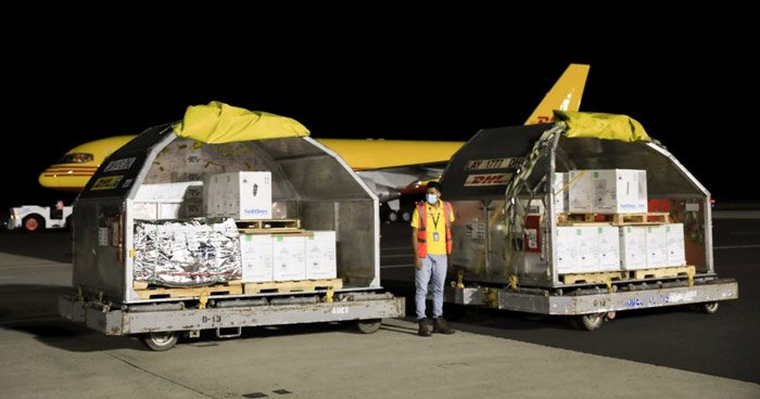 El cargamento arribó al país con más de 300 mil dosis de la farmacéutica Pfizer: 122.580 vacunas por compra directa y 188,370 dosis donadas por Estados Unidos a través del mecanismo COVAX.