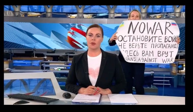 El lunes, cuando la presentadora de noticias Yekaterina Andreyeva estaba presentando una nota sobre las relaciones con Bielorrusia, Ovsyannikova, que vestía un traje formal oscuro, apareció de repente, sosteniendo un cartel escrito a mano que decía “No a la guerra” en inglés.