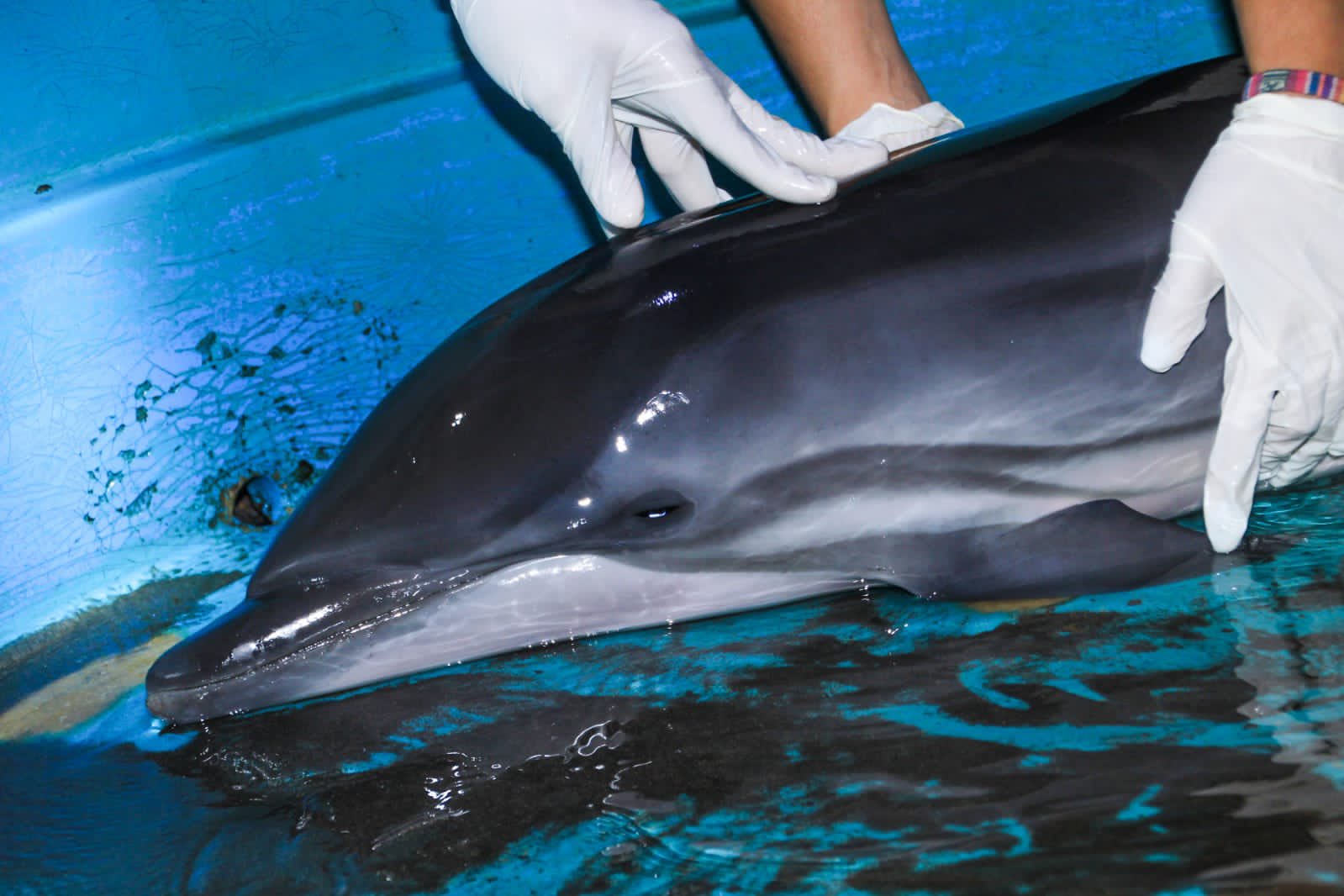 De acuerdo con la evaluación veterinaria preliminar, el cetáceo presentó lesiones en la zona de la cola y las aletas, y se encuentra en estado de shock.
